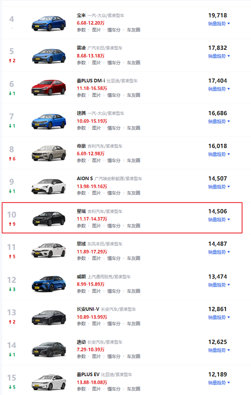 近日,各大汽車(chē)廠商今年10月份的銷量成績(jī)終于公布了,雖然A級(jí)轎車(chē)榜單前三名依舊和9月份一樣,都是被日產(chǎn)軒逸、大眾朗逸、豐田卡羅拉所占據(jù),但,10月份的A級(jí)轎車(chē)榜單卻出現(xiàn)了一款“黑馬”車(chē)型,因?yàn)檫@款車(chē)在9月銷量榜單里還是第十九名,但是到了10月份,卻以月銷14506輛的成績(jī),銷量“排名”直接上升了9個(gè)名次,躍居至10月份銷量榜單第十名位置,該車(chē)就是2023款全新吉利星瑞,這款車(chē)有什么特色呢?該車(chē)系哪款車(chē)型可以參考呢?一起來(lái)了解一下吧。